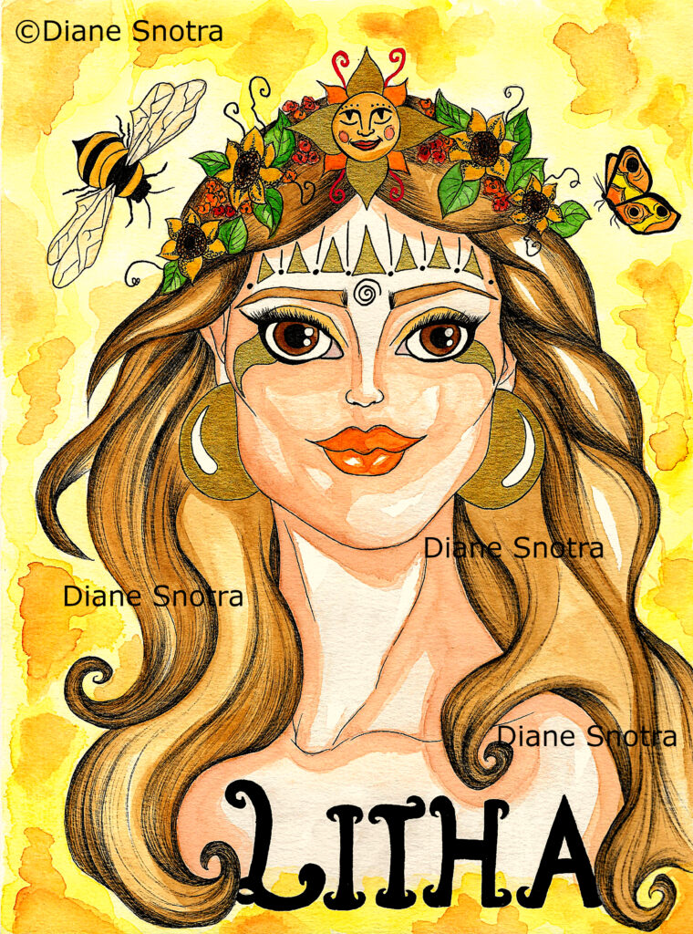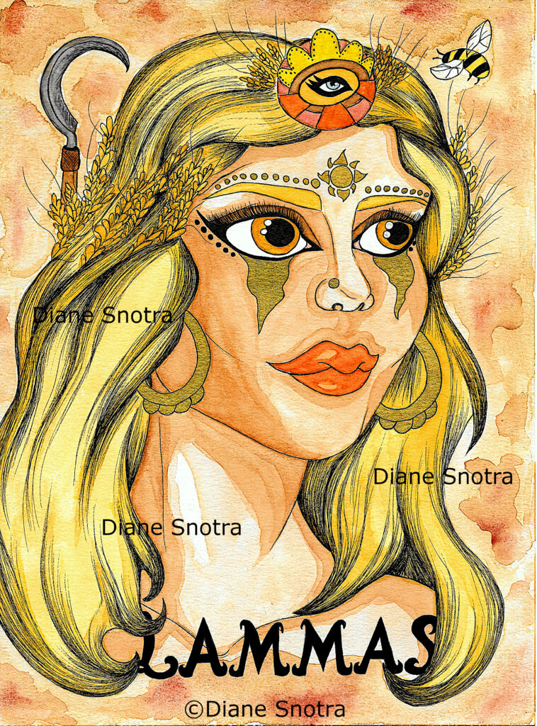 Là encore, j’ai utilisé les codes couleurs de ce sabbat associé aux récoltes que sont le jaune, le marron, le doré et le orange. Pour les symboles, j’ai évidemment incorporé des épis de blé dans la chevelure blonde de cette déesse, la faux ancestrale qui sert à faucher les blés mûrs, une abeille ainsi qu’un soleil doré sur son front. Et j’ai ajouté l’Œil Mystique sur le sommet de son crâne.