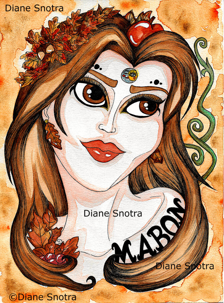 J’ai dessiné cette déesse de Mabon de trois quart avec le regard tourné au loin comme celle de Lammas en rapport avec cette mélancolie relative à la saison automnale et cette fois, j’ai décidé d’inclure le mot « Mabon » dans sa chevelure à l’instar des feuilles et des grains de raisins de telle sorte qu’on dirait qu’elle les enserre dans ses bras comme une maman attentionnée. J’ai ainsi voulu faire transparaître le côté sécurisant et cocooning que l’automne nous procure quand on reste blotti au chaud chez nous 😊