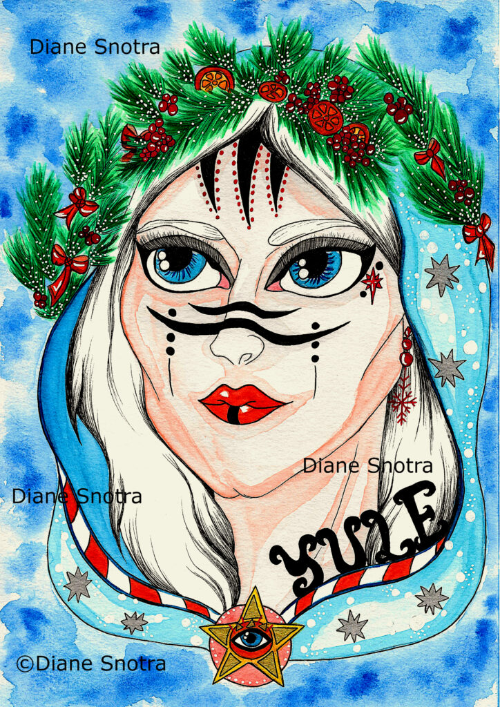 J’ai utilisé les codes couleurs du solstice d’hiver que sont le rouge, le bleu, le blanc, le vert et l’argenté. Pour ce qui est des symboles, j’ai dessiné une belle couronne de branches de sapin parsemées de neige et décorées de tranches d’oranges, de baies de houx et de jolis nœuds sur la tête de cette déesse. Sans oublier un petit flocon en guise de boucle d’oreilles❄️