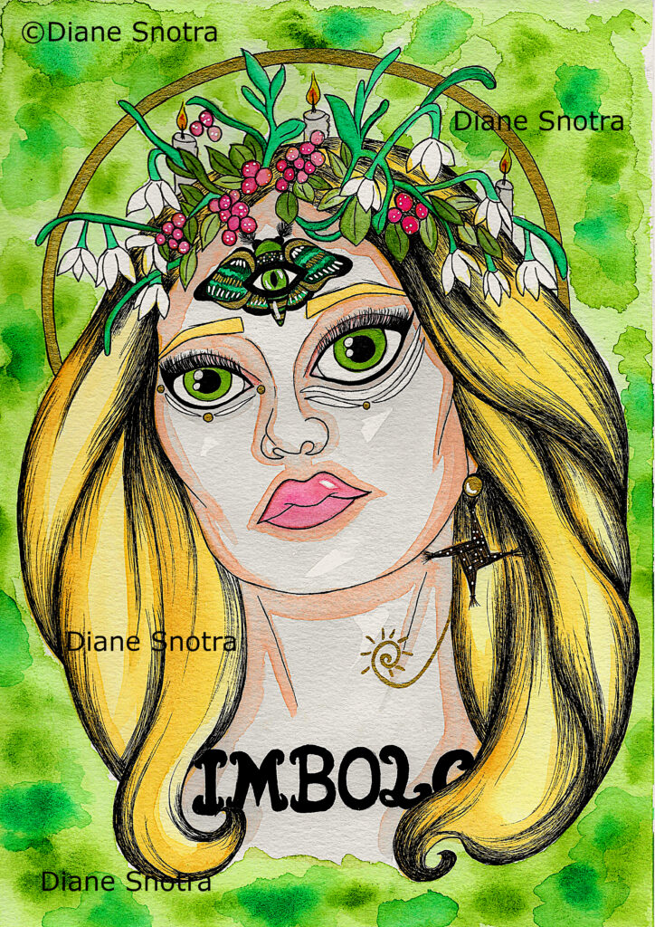 Et pour le symbole mystique, mon choix s’est naturellement posé sur Monarque de la Nuit, ce papillon de nuit qui évoque à la fois l’hiver et le printemps, exactement comme Imbolc ! Il orne le front de cette déesse et on a l’impression qu’il se dirige avec délice vers la jolie couronne de perces-neige.