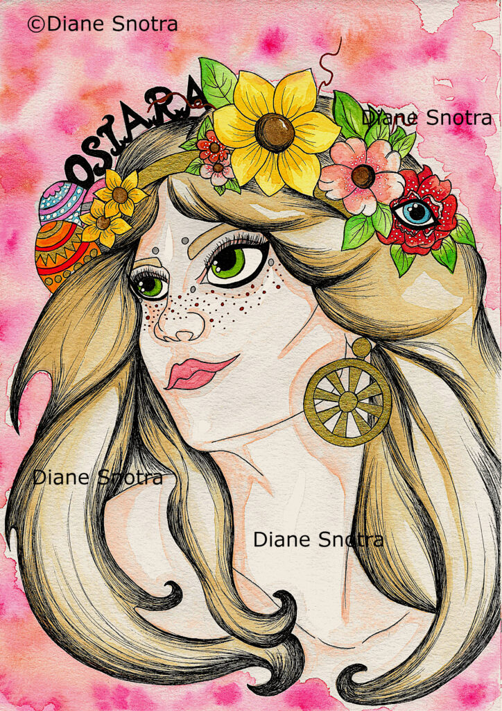 J’ai utilisé les codes couleurs de ce sabbat printanier de renouveau que sont le vert, le rose, le bleu clair, le jaune et le blanc. Pour ce qui est des symboles, j’ai dessiné des œufs décorés et colorés ainsi que des fleurs sur la chevelure châtain clair de cette déesse. J’ai également dessiné une roue solaire dorée en guise de boucle d’oreilles pour symboliser son retour triomphal !