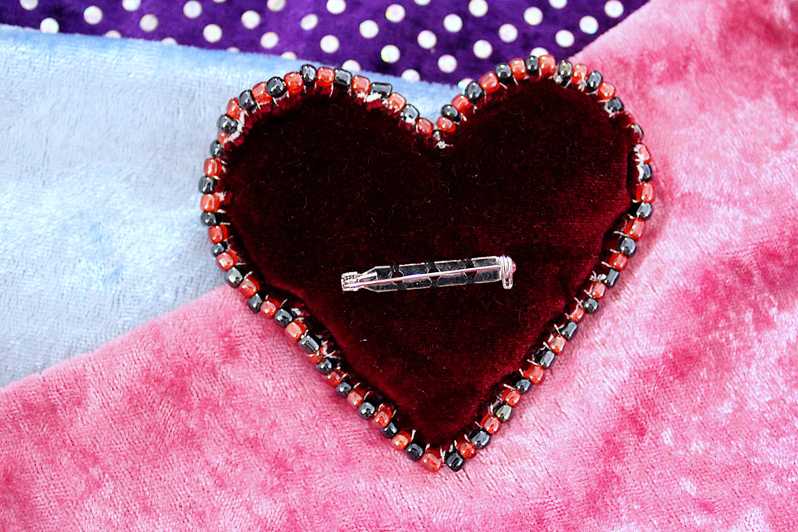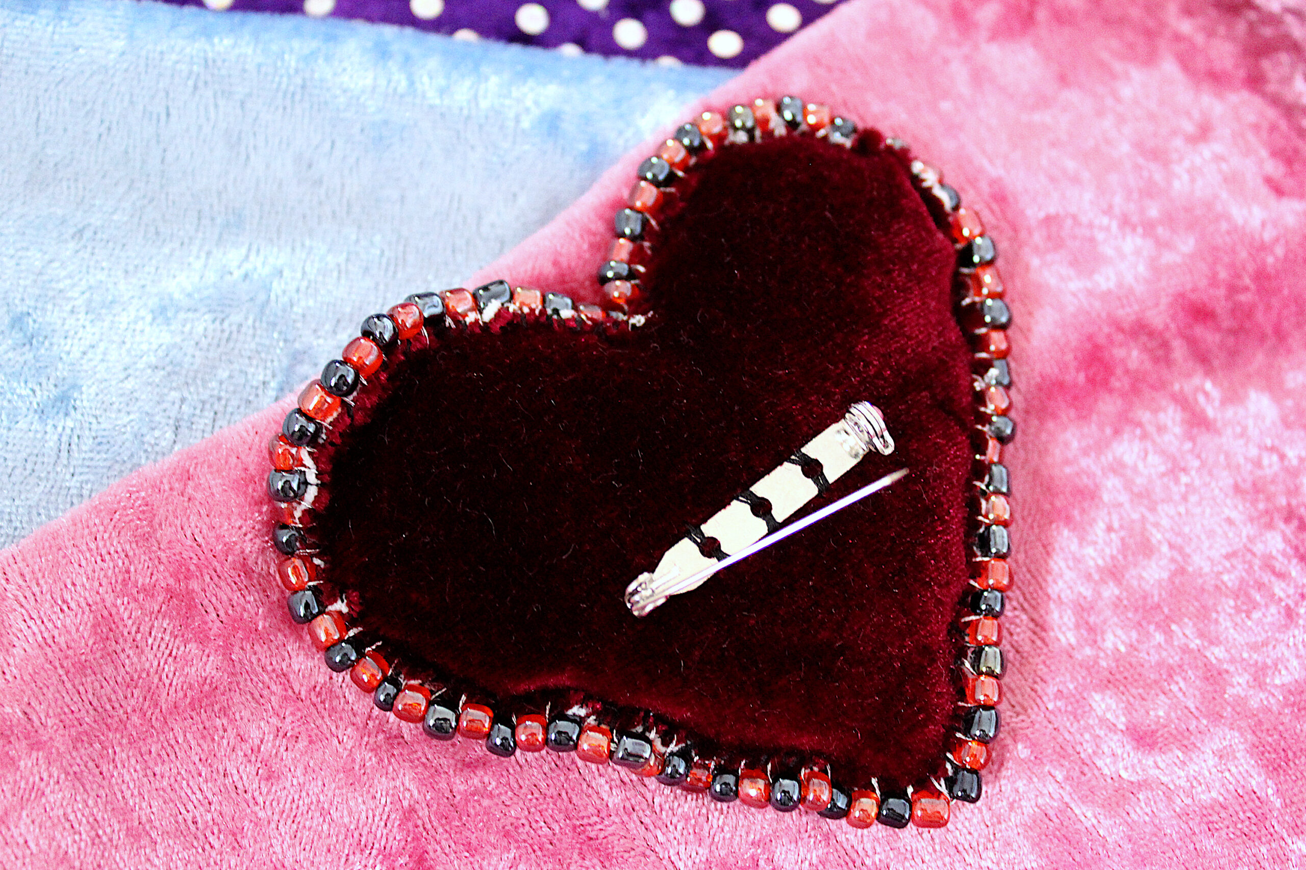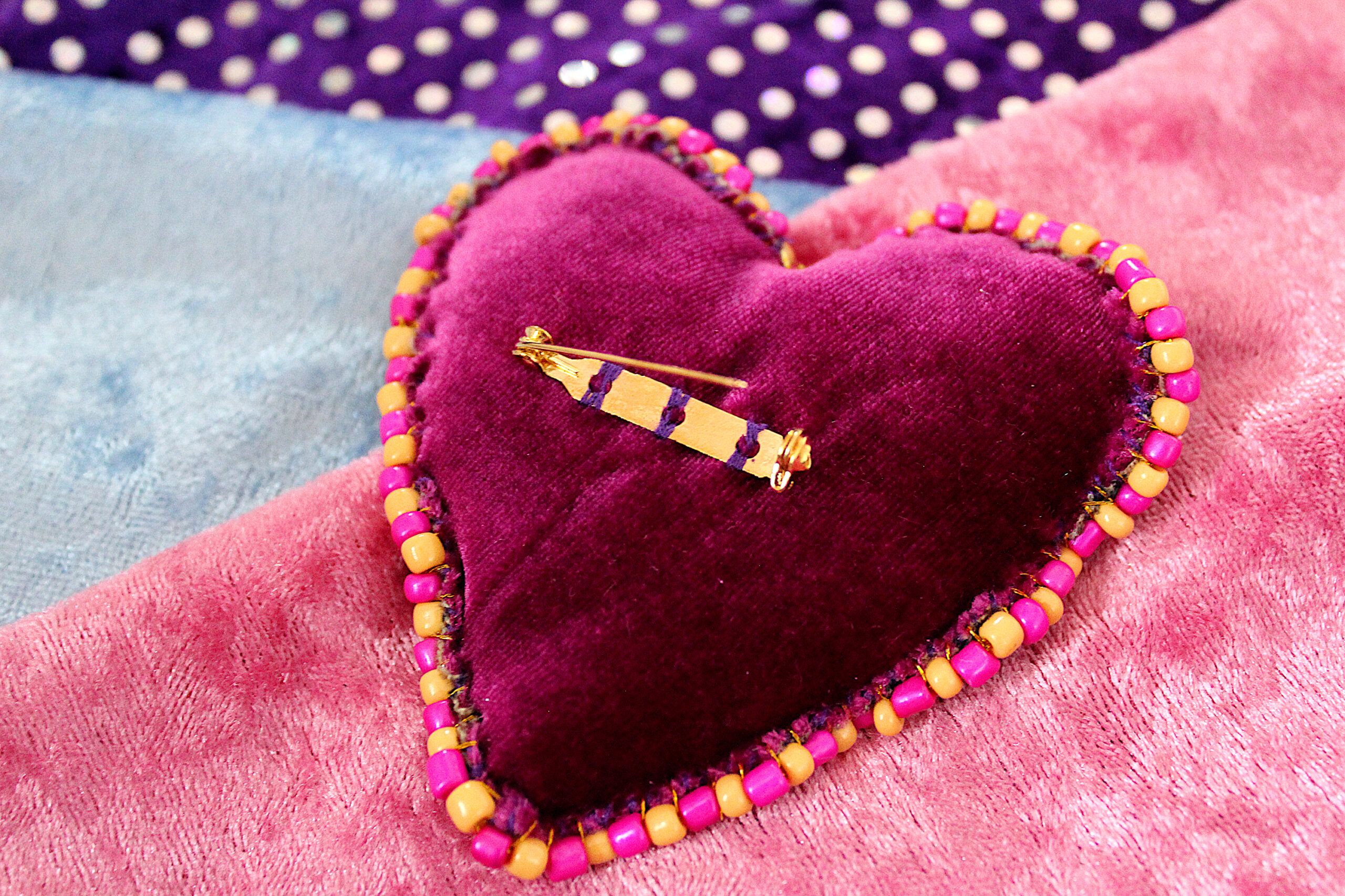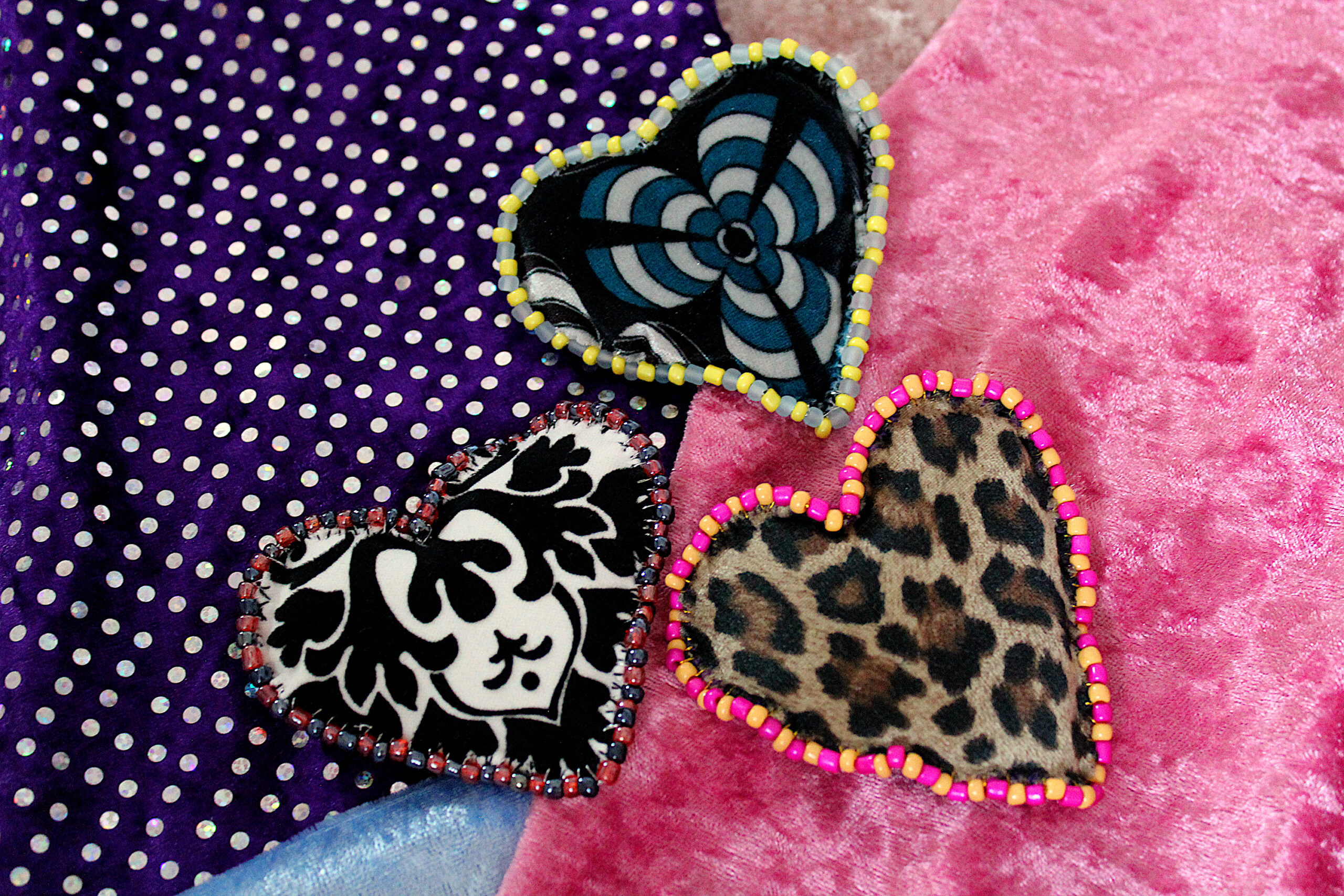 Ces trois broches sont des cœurs en tissus tout doux qui possèdent deux faces : une en velours avec des imprimés et une en velours uni. Le pourtour est brodé de perles fantaisies colorées.