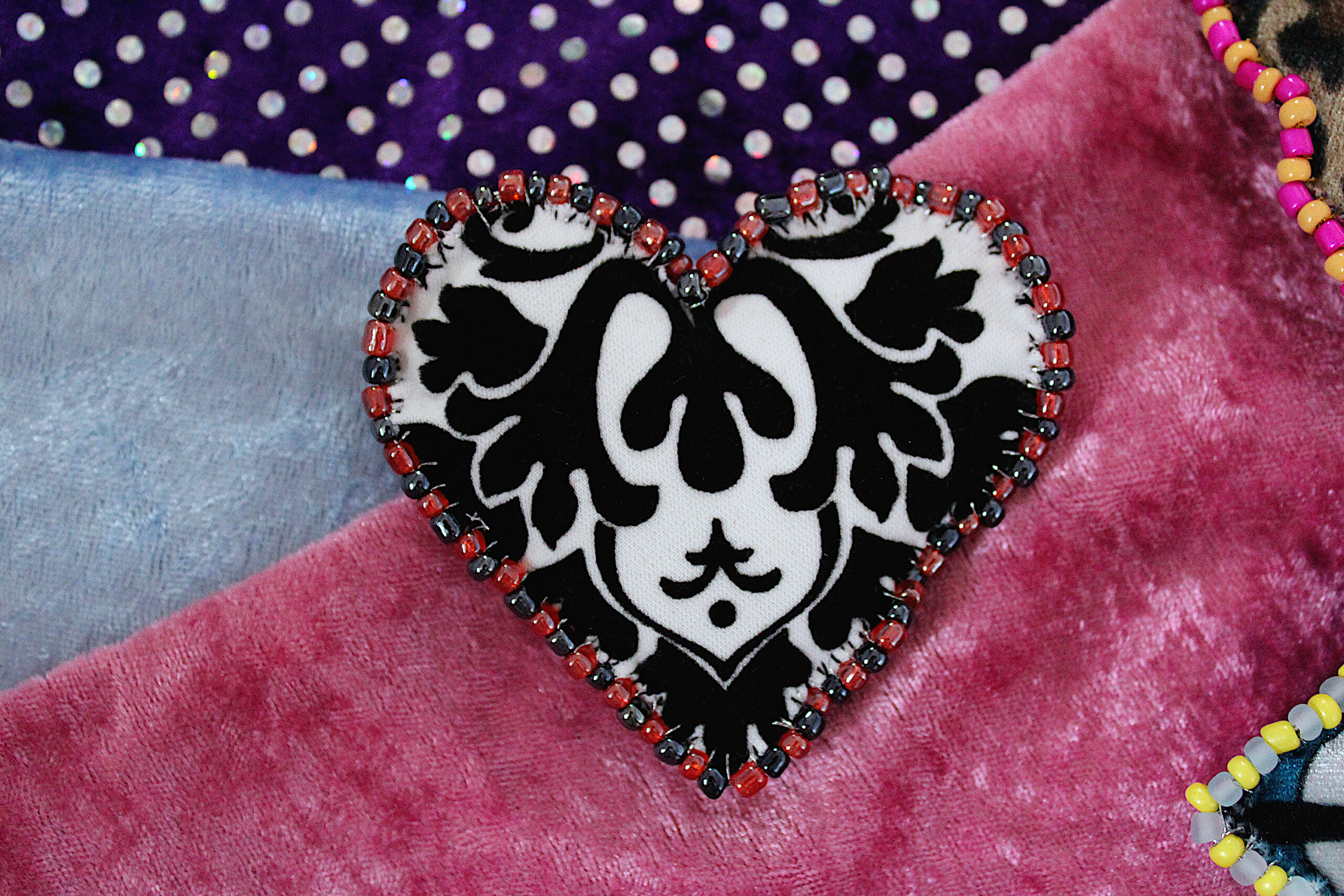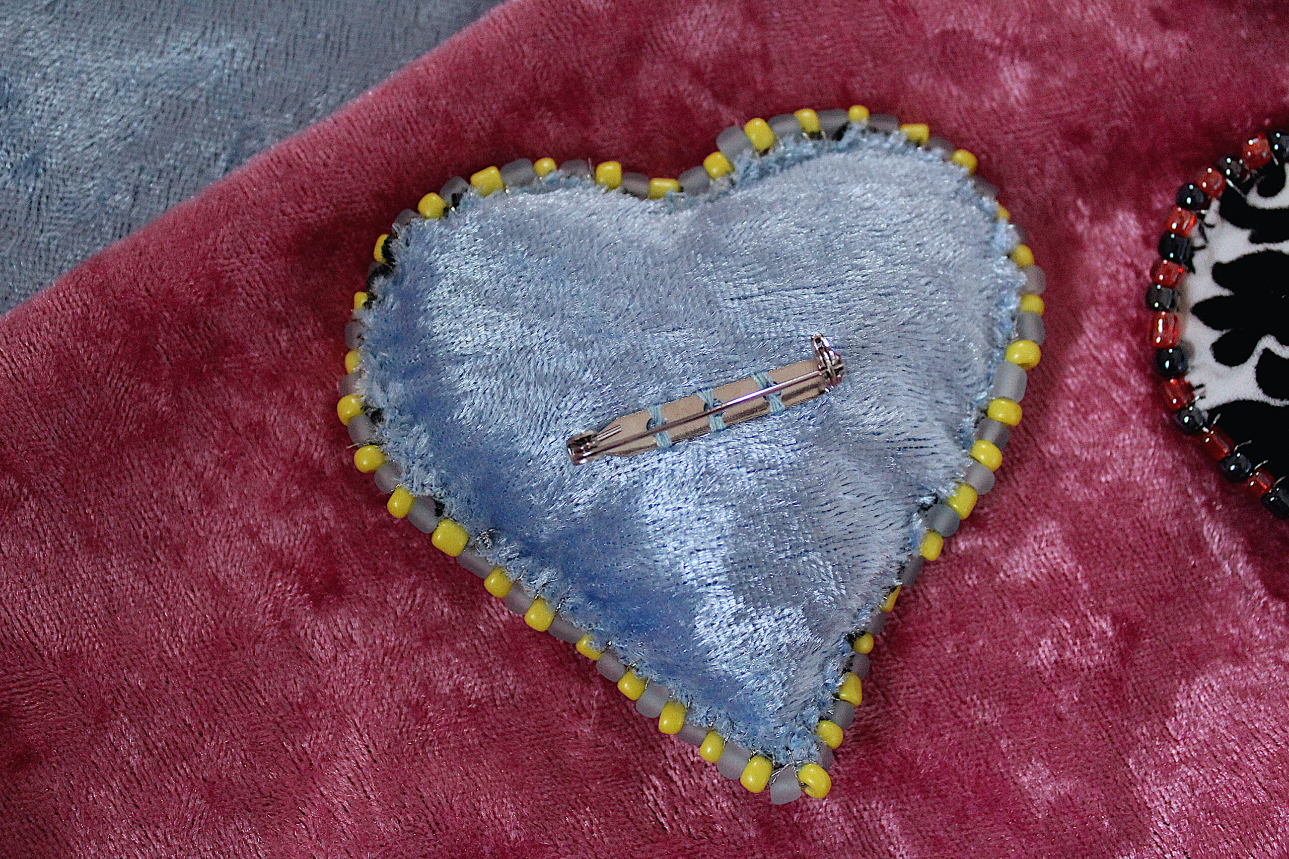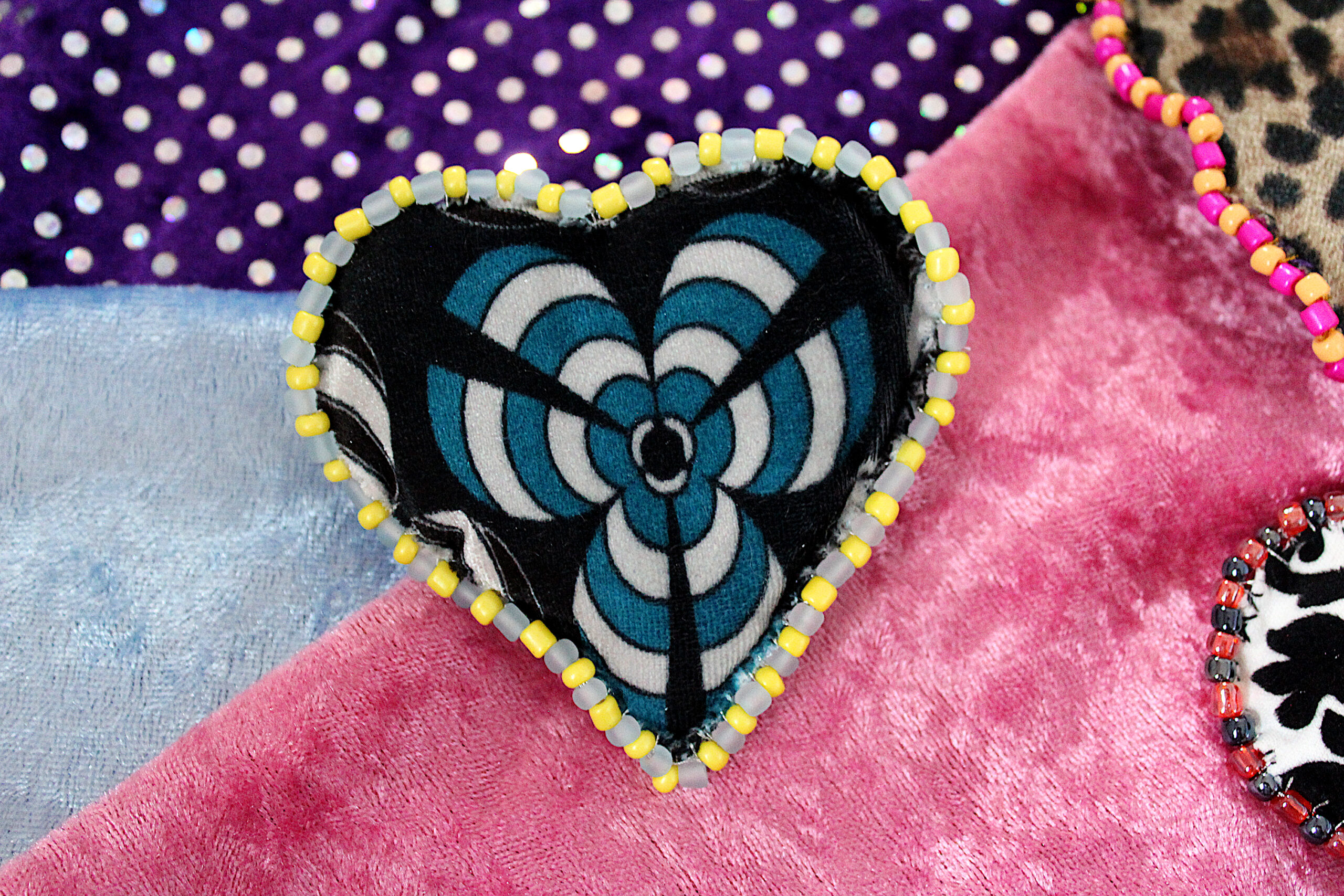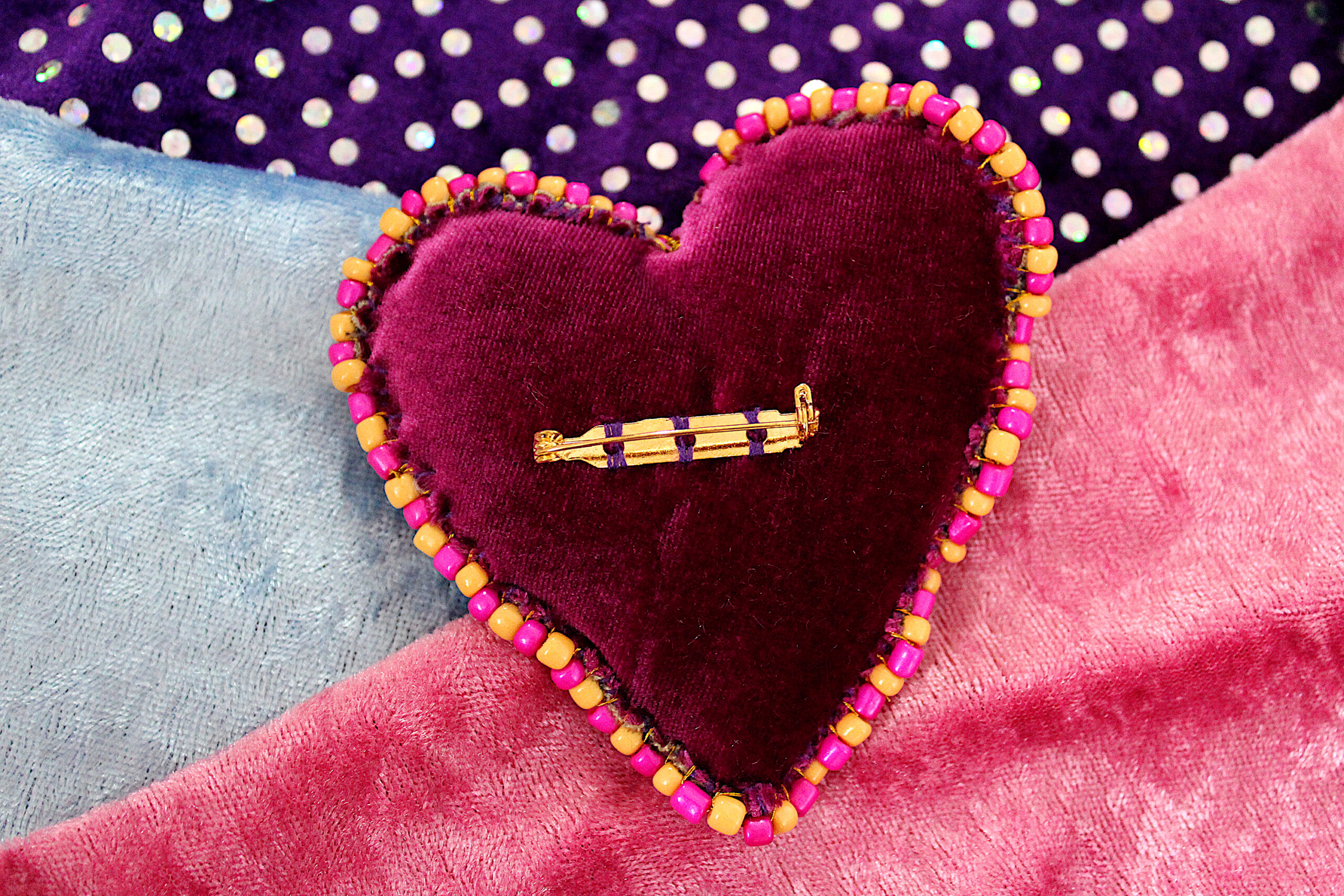 Ces trois broches sont des cœurs en tissus tout doux qui possèdent deux faces : une en velours avec des imprimés et une en velours uni. Le pourtour est brodé de perles fantaisies colorées.