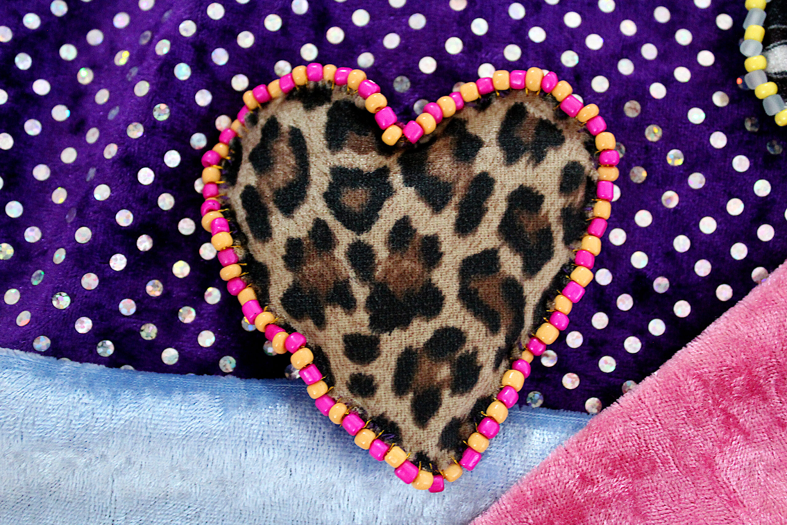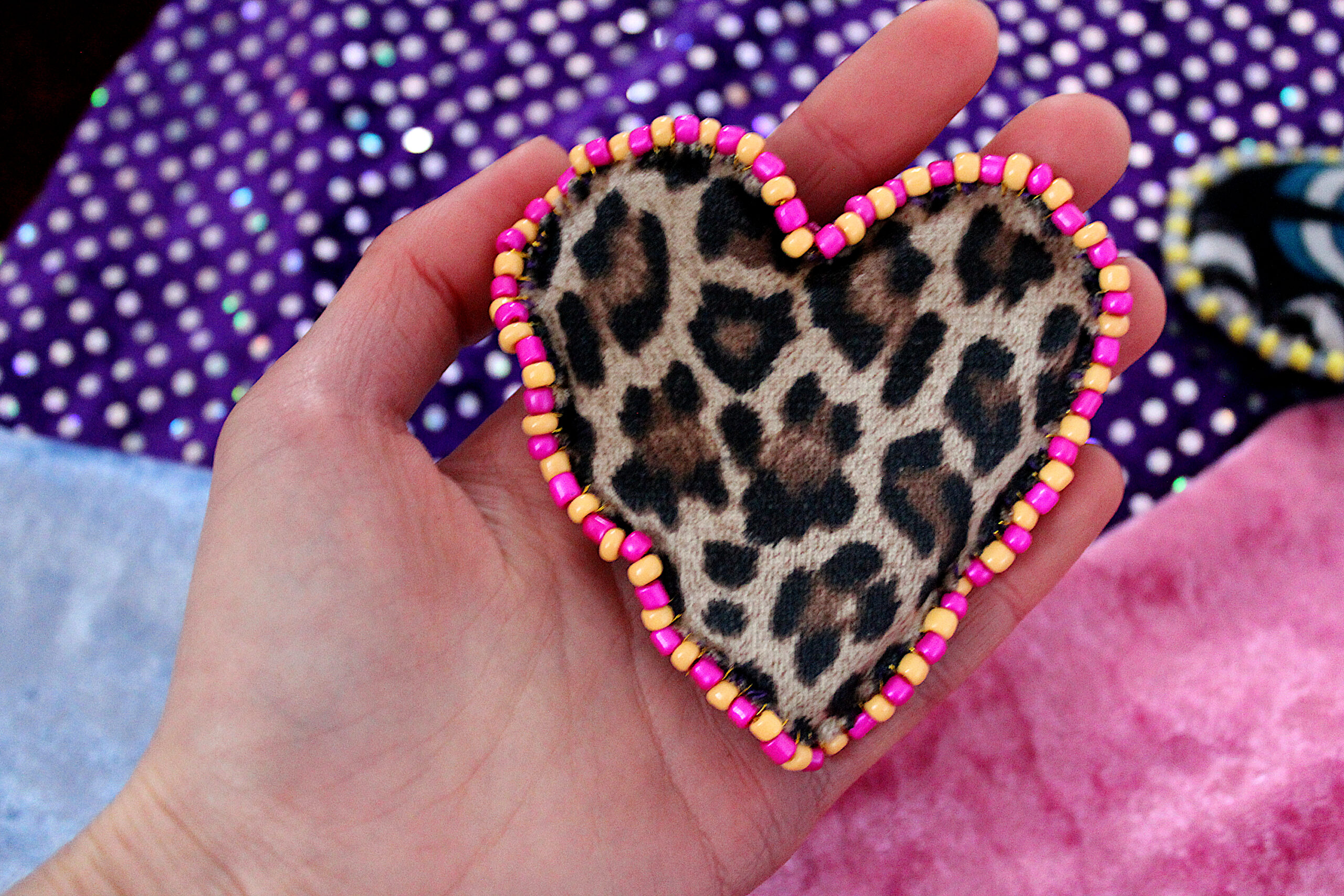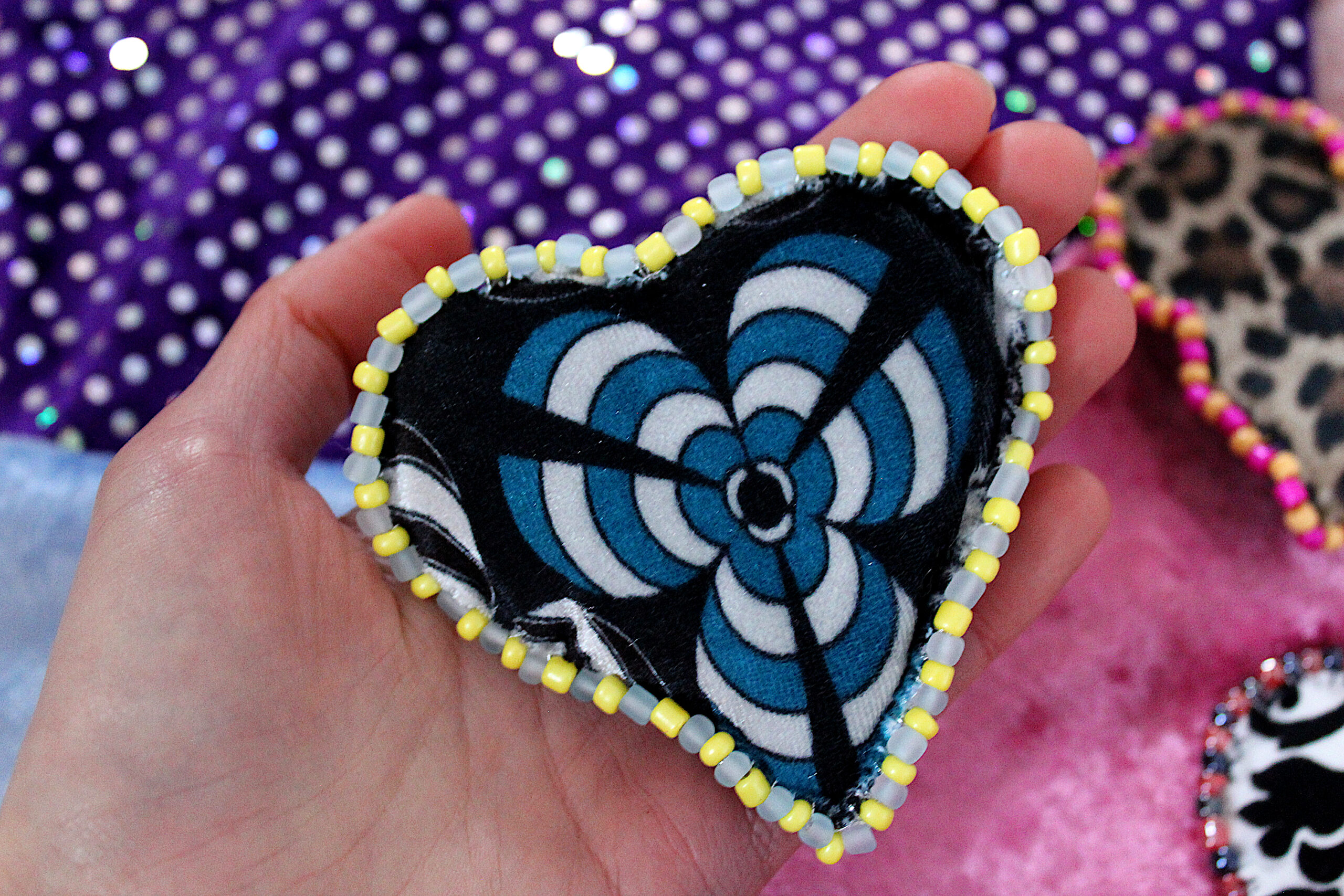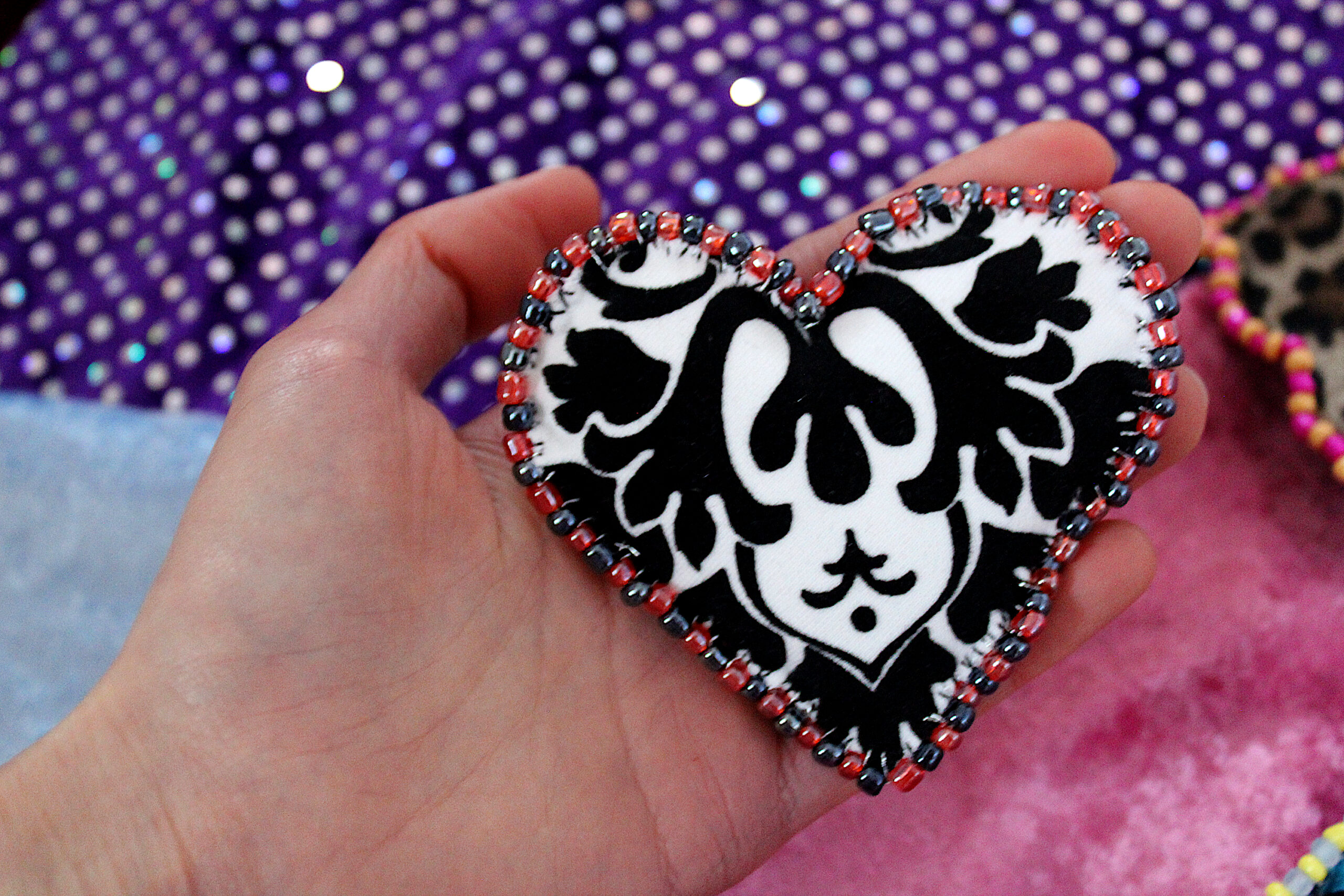 Ces trois broches sont des cœurs en tissus tout doux qui possèdent deux faces : une en velours avec des imprimés et une en velours uni. Le pourtour est brodé de perles fantaisies colorées.