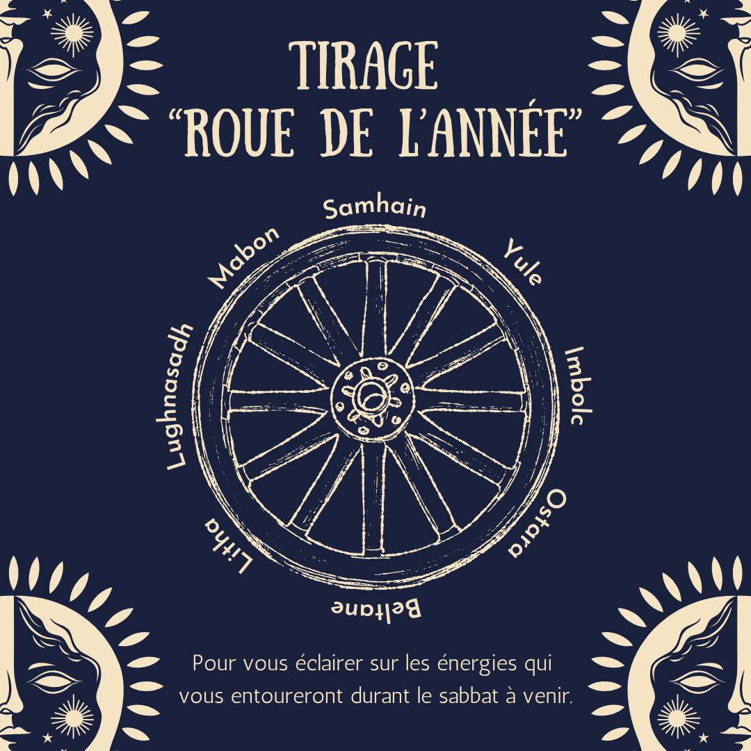 - Tirage « Roue de l’année » : pour vous éclairer sur les énergies qui vous entoureront durant la période du sabbat à venir
