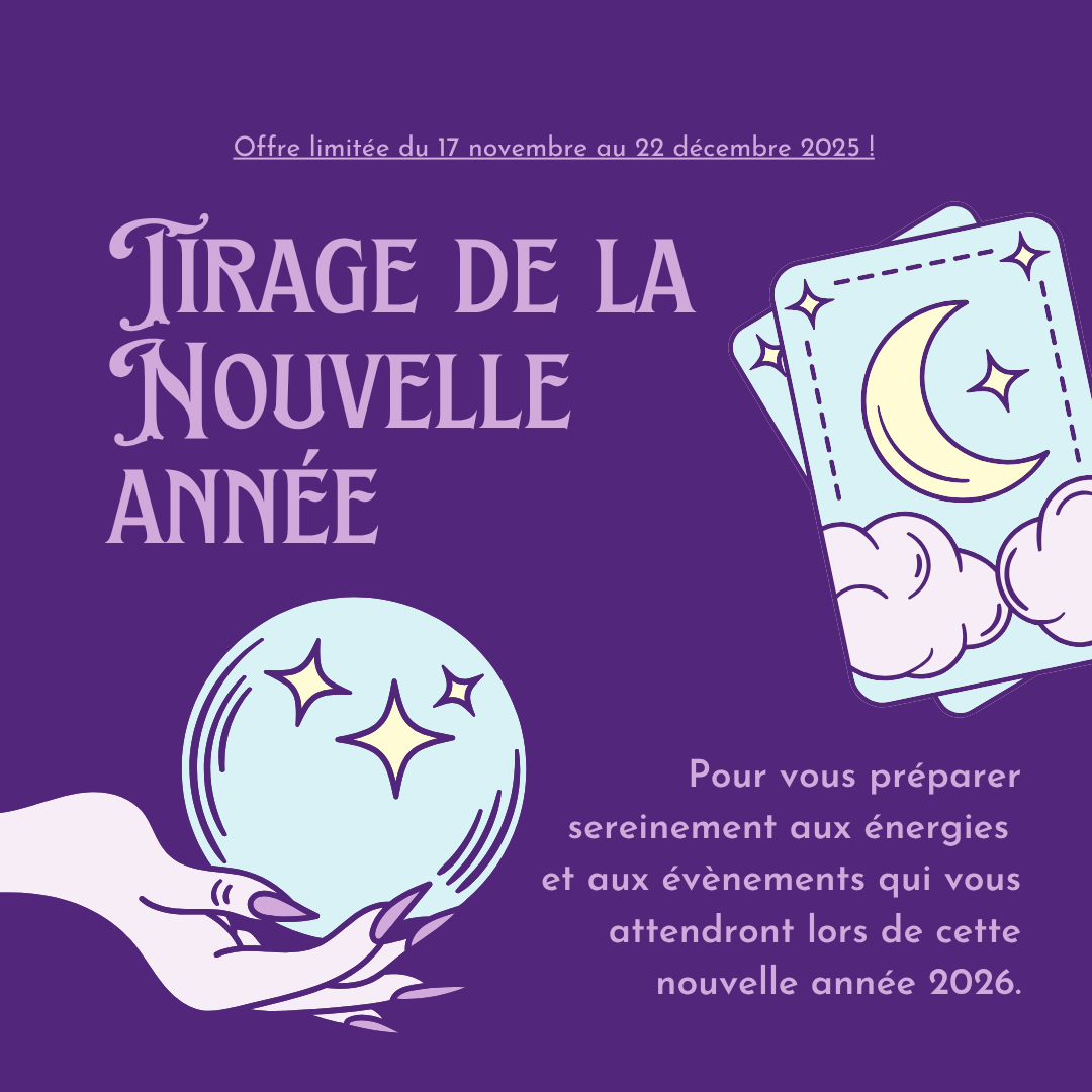 - Tirage de la Nouvelle Année : pour vous préparer sereinement aux énergies et aux évènements qui vous attendront lors de cette nouvelle année 2026 ! Offre limitée du 17 novembre au 22 décembre 2025 !